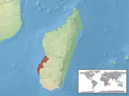 Ендемік Мадагаскару. Поширений на заході та південному заході Мадагаскару і трапляється в місцях з низькими висотами (від 20 до 100 м над рівнем моря) із залишковим лісистим покривом.