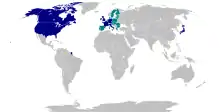 | Країна | Торгівля млн. USD (2014) | ВВП (номінал) млн. USD (2014)[6] | ВВП (ПКС) млн. USD (2014)[7] | ВВП (номінал) на душу USD (2014)[8] | ВВП (ПКС) на душу USD (2014)[9] | ІЛР (2015) | Населення (2014) | Рада Безпеки ООН | G7 | БРІКС | МІНТ | Комітет сприяння розвитку | ОЕСР | Економічна класифікація (МВФ)[10] |
