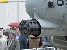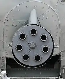 ![]() Ствол і затвор гармати GAU-8/A Avenger (справа фото видно барабан з набоями) | |