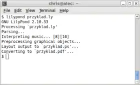 Файл потрібно зберегти з розширенням *.ly, після чого запустити з командного рядка команду lilypond ім’я файлу або просто перетягнути файл мишкою на значок програми. Якщо при наборі не було допущено помилок, буде згенерований pdf-файл з готовими нотами. У процесі генерації файлу автоматично створюється log-файл, в якому у разі помилки буде вказано причину, через яку згенерувати файл не вдалося. Результат показано на малюнку.