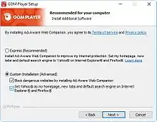 - Під час експрес-варіанту встановлення програма налаштовує браузери на пошукову систему Yahoo та встановлює програму блокування небезпечних сайтів Ad-Aware Web Companion. Для відмови потрібно обрати «Користувацьке встановлення» та зняти пташки із відповідних опцій.