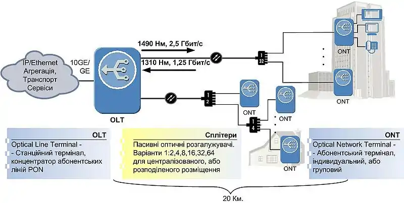 - Повністю пасивної оптичної розподільчої мережі між ними, яка складається зі сплітерів з коефіцієнтом розділення від 1:2 до 1:64, що розташовані централізовано, або розподілено.