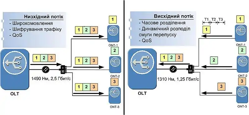 - У висхідному потоці працює принцип TDM. Кожен з ONT веде передачу тільки у своєму проміжку часу.