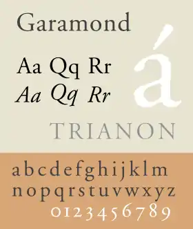 Garamond — сімейство гарнітур, які використовуються з XVI століття та були винайдені Клодом Гарамоном чи базуються на його працях. Garamond використовується в книгодрукуванні частіше за будь-який інший шрифт[2].