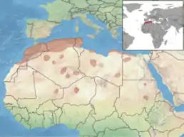 Проживає по всій Північній Африці і пустелі Сахара: Алжир, Єгипет, Лівія, Малі, Марокко, Нігер, Судан, Туніс. Присутній в посушливих місцях проживання в скелястих районах, також знайдений на орних землях.