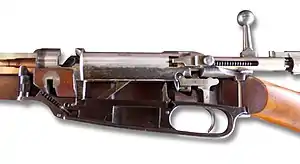 Боєприпаси: Завдяки вдалій зовнішній формі патрони добре вкладаються в обоймі, займають мало місця в магазині гвинтівки, подаються і досилаються затвором без затримок і дозволяють зробити затвор невеликого діаметра, що полегшує весь затвор і ствольну коробку. Тупоконечна куля в мельхіорової оболонці важить 14,62 г, заряд бездимного пороху 2,5 г. Початкова швидкість кулі 635 м/с. Вага патрону 27,32 р.