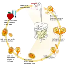 G. lamblia протягом свого життєвого циклу набуває двох морфологічно різних форм: трофозоїт і циста. Трофозоїт — це рухлива грушоподібна клітина, яка здатна мешкати лише в тонкій кишці хазяїна.[9] Трофозоїти пливуть крізь кишковий слиз, аж доки не прилипають до кишкового епітелію хазяїна.[10][9] Прилипнувши, трофозоїти починають процес поділу, при чому серед утворених дочірніх клітин можуть бути як трофозоїти, так і клітини стадії спокою — цисти.[9] Цисти проходять крізь товсту кишку хазяїна і виходять назовні разом із калом.[9] Вони стійкі до ушкодження і можуть перебувати зовні протягом тижнів, а то й місяців, за умови достатньої вологості.[10][11][9] Цисти залишаються неактивними, аж доки не потраплять у травний тракт тварини-хазяїна. Потрапивши в тіло нового хазяїна, умови тамтешнього середовища (послідовний вплив спершу хлоридної кислоти, а потім — панкреатичних ензимів) запускають процес перетворення цисти на два трофозоїти, які, діставшись до тонкої кишки, приклеюються до епітеліальних клітин її стінок, запускаючи весь цикл наново.[9]