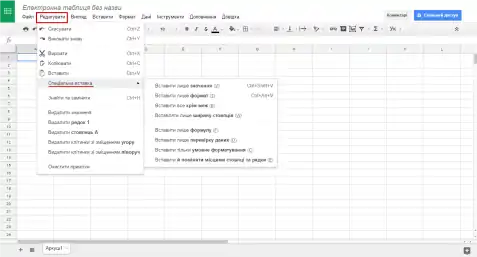 За допомогою вкладки «Правка» ви можете скасувати попередню дію, або повторити; вирізати що-небудь, скопіювати і вставити, знайти і замінити непотрібне на потрібне. Є також спеціальна вставка в google таблиці необхідних значень, форматів, формул, можна вставити і поміняти місцями вибрані стовпці або ж рядки: На вкладці «Вид» ви можете закріпити потрібні вам рядки і стовпці, вставити / прибрати сітку, захистити що-небудь від редагування (захищені діапазони), підключити / відключити панель формул.