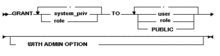 system_priv- системний привілейrole- роль — набір відповідних повноважень, які адміністратор може колективно надавати користувачам та іншим ролямuser- користувачPUBLIC- привілей передається всім користувачамWITH ADMIN OPTION- якщо надані системні повноваження або ролі, то параметр дозволяє користувачеві передати повноваження або роль іншим користувачам або ролям
