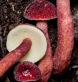 Плодове тіло пурпурово-червоного або темно-рожевого забарвлення. Шапинка 1,5-5 см у діаметрі, опукла, з віком вирівнюється. Ніжка заввишки 3-5 см, діаметром 0,5-1 см. Шапинка та ніжка при зрізі не синіють.