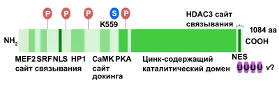Фосфорилювання/дефосфорилювання забезпечує швидку і ефективну репресію гістондеацетилаз (HDAC) класу ІІа, до якого належить і HDAC4. Оборотне фосфорилювання — регуляторний механізм, необхідний для функціювання HDAC4. HDAC4 взаємодіє з сімейством білків 14-3-3, які специфічно зв'язуються з фосфосерин-містними консервативними мотивами. Фосфорилювання цих залишків серину створює сайти зв'язування з шапероном сімейства 14-3-3, який супроводжує фосфорильовану HDAC4 при транспорті з ядра в цитоплазму. HDAC4 може фосфорилюватися такими білками: CaMK, ERK1/2, протеїнкіназа А (РКА) і GSK3[10].