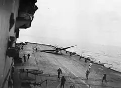 1 квітня 1945 року у наслідок атаки камікадзе поблизу островів Сакісіма на борту авіаносця загинуло 14 чоловіків, ще 16 отримали поранення. Хоча пожежу вдалося швидко локалізувати, постраждала головна острівна надбудова на кораблі.