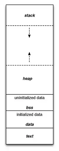 При створенні процесу в операційній системі під його потреби виділяється адресний простір[2][3][4], в якому розташовані користувальницькі дані, виконуваний код і деяка системна інформація, яка залежить від конкретної операційної системи. Користувальницькі дані розподіляються між купою і стеком в залежності від способу виділення пам'яті під них[5]. Так, у сегменті стека зберігаються змінні з автоматичним класом розміщення, а також інформація, яка зберігається при кожному виклику функції, наприклад, статичні змінні і адреси повернення при виклику функції. Купа — це область оперативної пам'яті, тобто при динамічному виділенні пам'яті місце виділяється в купі. Традиційно купа і стек ростуть назустріч один одному.