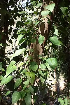 Це вічнозелена дерев'яна ліана з довгими стеблами, які ростуть в мішаних лісах до 20—30 м, на деревах; не зростає як ґрунтопокривна рослина. Вона піднімається за допомогою повітряних корінців, які чіпляються до підкладки.