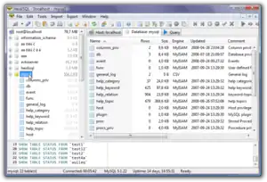 ![]() Основний екран активної сесії HeidiSQL з базою даних MySQL (ліворуч) та таблицями з цієї бази (праворуч) | |