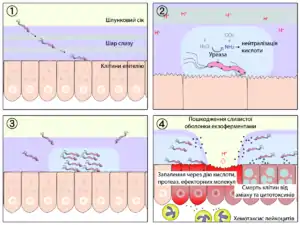 Муциназа, протеаза і ліпаза, що виробляються бактерією, викликають деполімерізацию і розчинення захисного слизу шлунка, внаслідок чого соляна кислота і пепсин дістають безпосередній доступ до клітин епітелію шлунка і починають роз'їдати їх, викликаючи хімічний опік, запалення і виразку слизової оболонки. Екзотоксини, що виробляються бактерією, викликають вакуолізацию і загибель клітин слизової оболонки. Протеази і ефекторні білки (зокрема, CagA) додатково підсилюють запалення і загибель клітин. Привернуті запаленням (зокрема, секрецією інтерлейкіна-8 клітинами слизової оболонки) лейкоцити виробляють різні медіатори запалення і хімічно агресивні речовини (зокрема перекис водню), що приводить до прогресу запалення і росту виразки[22].
