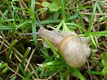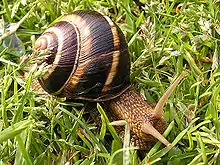 ![]() Равлик Helix aspersa на квітках кермеку | ||||||||||||||