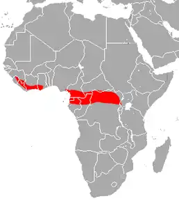 Країни поширення: Камерун, Демократична Республіка Конго, Кот-д'Івуар, Габон, Гана, Гвінея, Ліберія, Нігерія, Сьєрра-Леоне, Уганда. Зустрічається від рівня моря до 500 м. Цей вид пов'язаний з первинними тропічними низинними вологими лісами. Не схоже, щоб був присутнім у деградованих лісах. Тварини були знайдені спочиваючими в дуплах дерев.