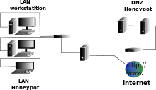 Різні варіанти розміщення honeypot допоможуть дати повні відомості про тактику нападника. Розміщення honeypot всередині локальної мережі дасть уявлення про атаки зсередини мережі, а розміщення на загальнодоступних серверах цієї мережі або в DMZ — про атаки на незахищені мережеві служби, такі як: поштові сервіси, SMB, ftp-сервери і т. д.