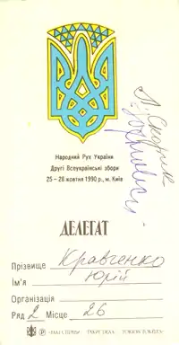 | Картка делегата з автографами Скорик Л. П. та Юхновського І. Р. |