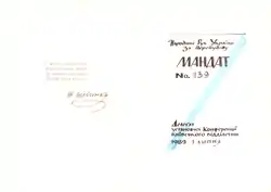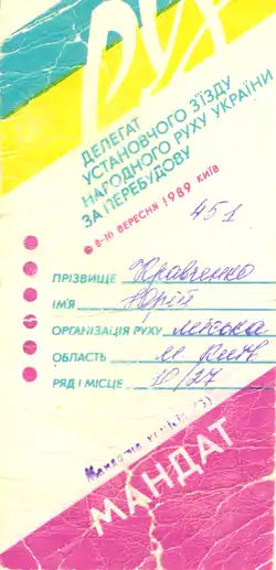 | Установча Конференція, 01.07.1989 Мандат делегата установчої Конференції Київського відділення Народного Руху України за Перебудову | |