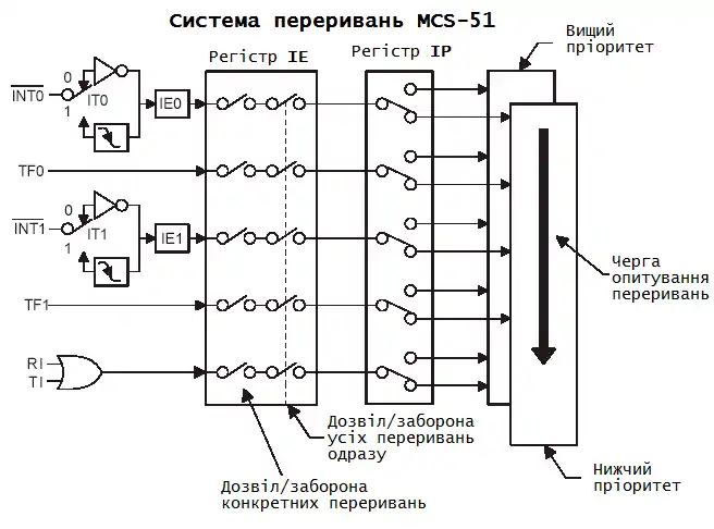 - Система з 5 переривань, з 2 рівнями пріоритетів