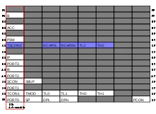 | ACC | Акумулятор | E0H | 00H | Цей регістр означає те саме, що і A при програмуванні на асемблері, проте позначення А вказує на роботу з акумулятором, а позначення ACC вказує на роботу з байтом пам'яті. Відповідно, використання мнемоніки A дозволяє скоротити довжину інструкції. |
