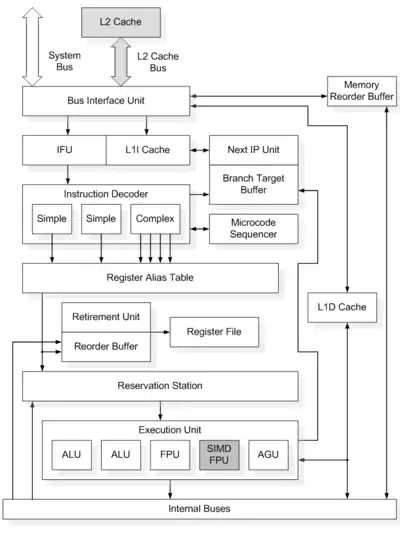 - Таблиця призначення регістрів (Register Alias Table) — задає відповідність між регістрами архітектури x86/IA32 (Intel Architecture 32-bit) і внутрішніми регістрами, використовуваними при виконанні мікрооперацій.