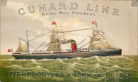 | 63 | 15.08.1863 / 1863 | Tripoli BRT=2057 292,5/ 38,2/ футів | «British & North American Royal Mail Steam Packet Company» (з 7 серпня 1878 року «Cunard Line») | пасажирсько-вантажний пароплав - трансатлантичний лайнер; паровий, одно-гвинтовий двигун, 280 HP Швидкість 11 вузлів | Спочатку призначався для середземноморського сервісу, але потім, 9 серпня 1865 року, почав свій перший трансатлантичний рейс від Ліверпулю до Галіфаксу і Нью-Йорку. Кораблетрощення 17 травня 1872 року на скелі Таскар (англ. Tuskar Rock), Протока Св.Геогія (англ. St George's Channel), - без втрати життя людей. |