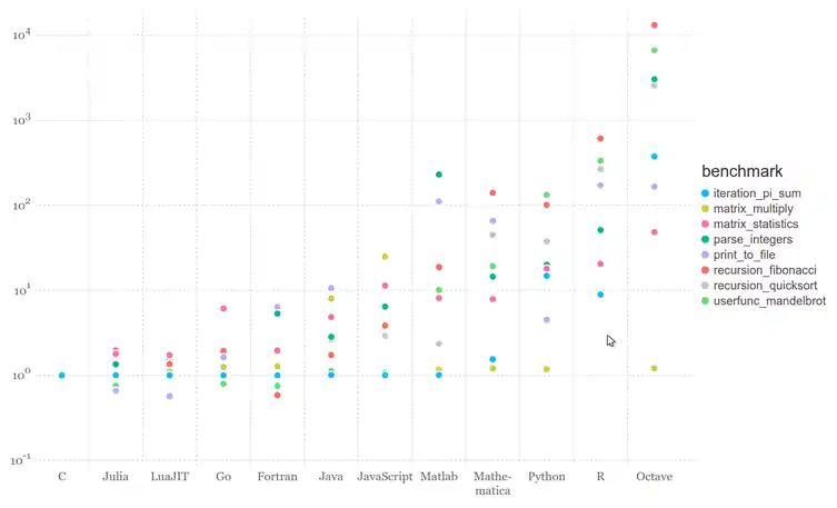 Компілятор JIT (just-in-time), розроблений на основі LLVM Julia, у поєднанні з його дизайном, дозволяє мові відповідати продуктивності C-мови в декількох сценаріях. Щоб отримати уявлення про відносну продуктивність Julia в порівнянні з іншими мовами, які може бути використано для чисельного та наукового обчислення, ми пишемо невеликий набір мікро-тестів різними мовами: C, Fortran, Julia, Python, Matlab / Octave, R, JavaScript, Java, Lua, Go і Mathematica. Результати наступних мікро-тестів було отримано з використанням одноядерного (послідовного виконання) процесора Intel Core i7-3960X з частотою 3,30 ГГц із 64 Гб 1600 МГц оперативної пам'яті DDR3, за допомогою дистрибутиву openSUSE LEAP 42.3: