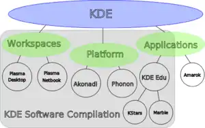 Версії з 4.0 до 4.3 знані просто як KDE-, після версії 4.4 назва була змінена на KDE Software Compilation. До KDE SC входять тільки ті застосунки, графік розробки яких узгоджується із графіком розробки KDE SC. У тому числі з цієї причини до KDE SC не входять такі програми, як Amarok та DigiKam.