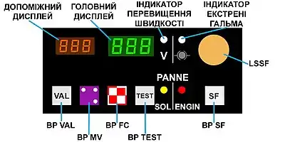 - Індикатор активування екстрених гальм (білий) (“FU”) - вмикається при введенні в дію екстрених гальм. Гальма вмикаються при перевищенні дозволеної швидкості поїзда на 10 км/год;