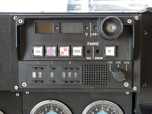 - Перемикач класу поїзда з трьома позиціями: пасажирські поїзда (фр.Voyageur), кур’єрські (легкі вантажні поїзда з різноманітним вантажем, що часто курсують вночі, при більшій швидкості, ніж вантажні і з меншою кількістю вагонів(фр.Messagerie)) та важкі вантажні поїзда(фр.Marchandise).