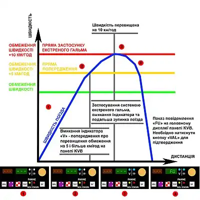 Якщо швидкість поїзда перевищує або дорівнює встановлене на маршруті обмеження більше ніж на 5 км/год, машиніста попереджає: