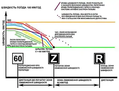 - Криву зменшення теперішньої швидкості поїзда (якщо вона зменшується)
