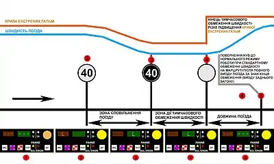 Якщо швидкість поїзда стає небезпечною для даних умов (перевищує обмеження на величину 10 км/год) система вводить в дію екстрені гальма.