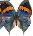 Розмах крил 85-110 мм. Верхня сторона крил синього кольору з металевим відблиском і помаранчевими смужками. Нижня сторона крил світло коричневого забарвлення. Коли метелики сідають на гілку і складають крила, то стають схожими на сухе листя з виразною серединною жилкою і подобою черешка, який утворений хвостиками заднього крила.[2][3]