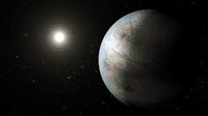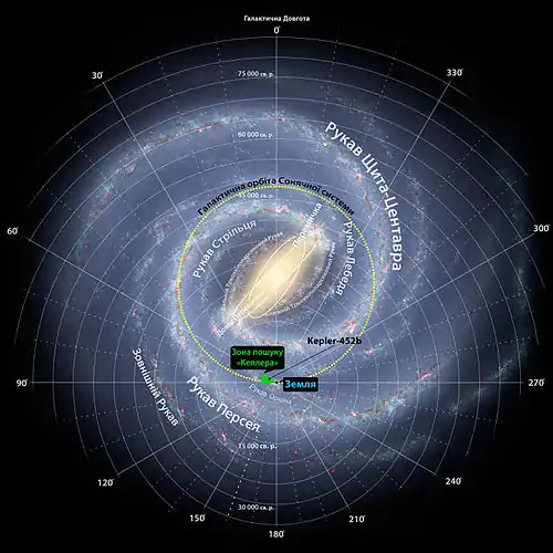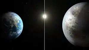 Kepler-452b (KOI-7016.01, інколи називають Земля-2) — екзопланета на орбіті жовтого карлика Kepler-452, розташованого в сузір'ї Лебедя. Екзопланету виявлено за допомогою космічного телескопа «Кеплер» транзитним методом — шляхом спостереження за зміною яскравості її материнської зорі, спричиненою проходженням планети на її тлі. Kepler-452b — перша з відкритих потенційно скелястих надземель, яка обертається навколо доволі схожої на Сонце зорі в зоні, придатній для життя. Згідно з індексом подібності Землі, Kepler-452b — четверта у списку планет, схожих на Землю.![]()