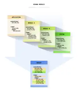 - Каскадні ресурси, модулі й спадкування. Контролери, моделі, бібліотеки, хелпери, і види можуть бути завантажені з будь-якого місця вашої системи, програми, або модуля. Опції конфігурації спадковувані і можуть динамічно перезаписуватся кожним застосунком.