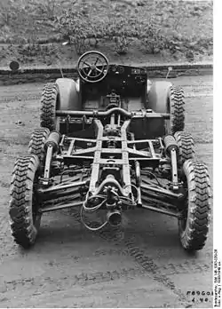 - Підвіска: передня — класична ресорна, задня підвіска[11] — незалежна пружинна, змонтована на вузькій поздовжній лонжеронній рамі U-подібного (хребтового) типу, до якої жорстко кріпилися головні черв'ячні передачі з самоблокуючимися кулачковими диференціалами. Кожне ведуче колесо встановлювалося на поперечних трубчатих важелях, що кріпилися до поздовжнього штампованого балансира, який хитався навколо поперечної осі. Роль пружних елементів виконували горизонтальні гвинтові пружини[11], що розташовувалися між кожною парою балансирів. Настільки складна система виявилася досить компактною і забезпечувала гарну пристосовність коліс до профілю шляху, дозволивши відмовитися від складного приводу на передні колеса