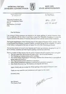 16 вересня 2020 року англійська Вікіпедія перейменувала статтю про Київ із «Kiev» на «Kyiv»[31].