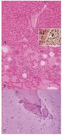 ![]() Weissella confusa у зразку тканин мавпи (забарвлення гематоксиліні та еозином): A) печінка, B) гостра пневмонія, C) енцефаліт | ||||||||||