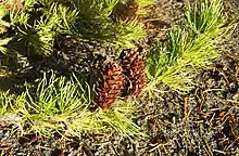 Дерево до 50 м заввишки; довгий чистий стовбур сягає 200 см в діаметрі на рівні грудей; крона коротка, конічна. Кора тонка і лущиться молодою, у дорослих дерев стає товстою (до 15 см), глибоко борозенчастою, червонувато-коричневою. Гілки горизонтальні, іноді опущені в нижній частині крони. Бруньки темно-коричневі. Голки довжиною 2–5 см шириною 0,65–0,80 мм, товщиною 0,4–0,6 мм, м'які, блідо-зелені, стаючи яскраво-жовтими восени. Насіннєві шишки овальні, коли закриті, яйцюваті, коли відкриті, розміром 2–3 × 1,3–1,6 см, на вигнутих стебельцях. Пилок 71–84 мкм діаметром. Насіння червонувато-коричневе, корпус 3 мм, крило 6 мм. 2n = 24.