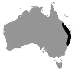 Зустічається в лісах на сході Австралії від Сіднея на півдні до центрального Квінсленда на півночі.
