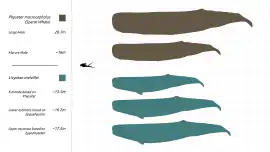 ![]() Порівняння розмірів Livyatan melvillei (синього кольору) з людиною і кашалотом | ||||||||||||||||||||||
