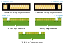 Друковані плати карт розширення M.2 на одному з країв надають ножовий роз'єм з 75 позиціями. В залежності від типу модуля, замість частини позицій зроблені ключові розрізи. Слот M.2 на материнській платі може мати заглушки на деяких ключових позиціях, визначаючи тип модулів і інтерфейси сумісні з ним. Станом на квітень 2014 року, слоти виконувалися з єдиною заглушкою, або в позиції B, або в M.[10] Наприклад, модуль M.2 з двома ключовими розрізами B і M може використовувати до двох ліній PCI Express і сумісний з великою кількістю слотів, тоді як карти M.2 з ключем у позиції M можуть використовувати до 4 ліній PCI Express. Обидва варіанти можуть використовувати лінії SATA. Подібна система ключів використовується для карт M.2 з інтерфейсом USB 3.0.[11]