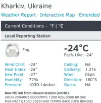 Приклад: UKDD 211230Z 27005MPS 240V330 0100 R26/0175N FG VV000 05/05 Q1023 26210358 NOSIG — аеропорт Дніпропетровськ, 21-го числа станом на 12:30 за всесвітнім часом (UTC), вітер 270° швидкістю 5 м/с зі зміною напрямку від 240° до 330°, горизонтальна видимість 100 метрів, дальність видимості на ЗПС 26 — 175 метрів без найближчих змін, туман, нульова вертикальна видимість, температура повіттря 5 °C, температура точки роси 5 °C, працююча ЗПС 26, волога або вода на поверхні, забруднення не більше 10 %, опади глибиною до 3 мм, коефіцієнт зчеплення 0.58