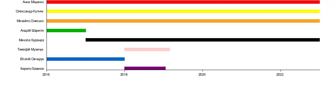 Андрій Шаригін (2016—2017) Віталій Овчарук (2016—2018) Кирило Бавикін (2018—2019) Тимофій Музичук (2018—2019) |