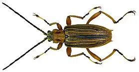 Жук довжиною 5,5-8,5 мм. Перший сегмент задніх лапок набагато коротший другого. Передньоспинка майже квадратної форми. Шип на вершинах надкрил довгий, тонкий. Голова і щиток з червоно-жовтими волосками, передньоспинка та надкрила мають жовте забарвлення, крапки в борозенках і часто опуклі міжряддя на надкрилах чорні.