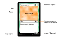Традиційно сорочка карток незмінна, на ній зображено логотип гри та п'ять кольорів магії. Зворотний бік має назву картки, її вартість у мані (якщо є), ілюстрацію приблизно на половину картки, тип (зачаровування, янгол тощо), належність до набору і рідкісність, опис її можливостей, значення атаки/здоров'я (якщо істота) або відданості (якщо Світоходець) та код картки, ім'я ілюстратора й правову інформацію. Фон картки має текстуру кольору, відповідного кольору магії даної землі або чари. Низка карток двоколірні і їхні фони плавно переходять з одного кольору в інший. Рамки переважно чорні, але можуть різнитися, залежно від видання.
